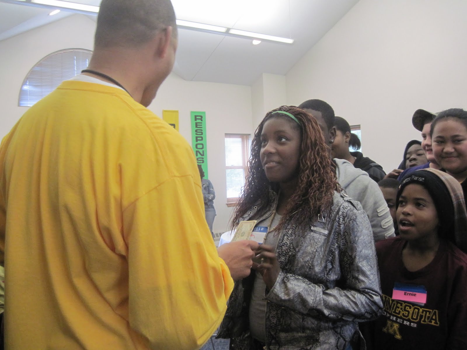 After fun ice breakers, the young people had the chance to "speed network" during their yummy lunch. During the end of the interview, all the youths were given a mathemathematical question to answer, and in exchange for their answer they recieved a gift from Rob, and got a Gopehers t-shirt to show their spirit. Pumped and ready to go, everyone helped cleaned.